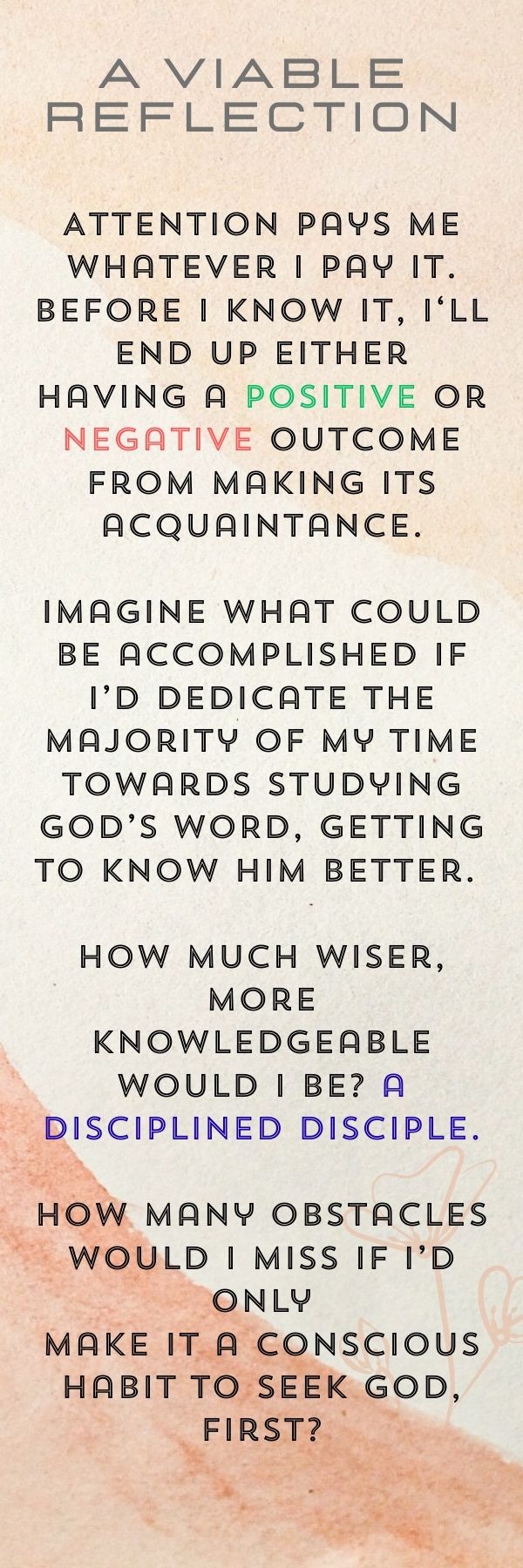 A Viable Reflection is a bookmark that is a poem about understanding the totality, the fullness of the inner self, that is exemplified on the outer man. It's a call to action for us to consider that we need more time with Christ and less and less time with other people and other things (i.e. social media). It's about building the core of you to become a true disciple, a true follower of Christ, not as we see it, but as GOD has already explained that we should live under and by. It reminds us that it's better to be obedient to GOD's Word and His Words so that we aren't caught in a situation that He's forced to make us do what we already knew He's required all along. GOD is patient, and kind, however, He won't stand to be disrespected for too long. His wrath is hard but He remains faithful and loving towards His Creation, His People. So, in return, we offer obedience and know that every obstacle that the enemy has thrown in our way can be demolish & cancelled when and only when we are obedient to GOD and know His Word, Romans 8:28,31,37.